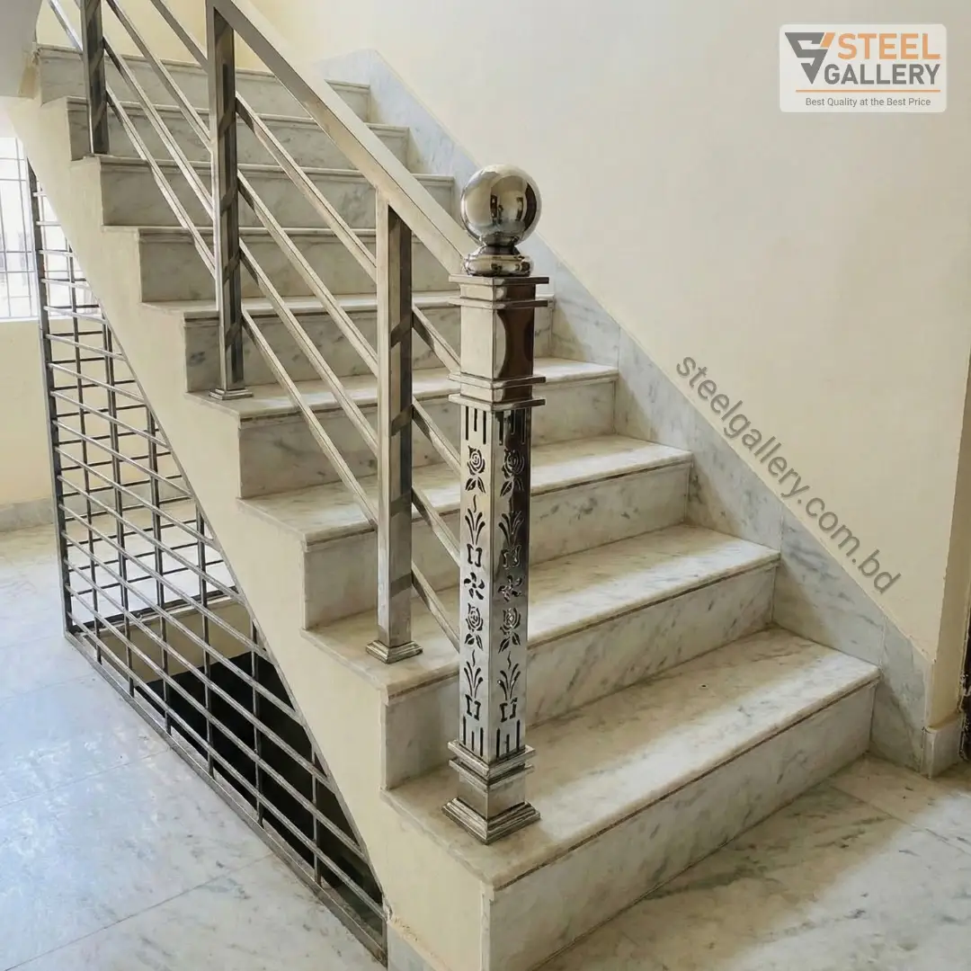 যারা সিঁড়ির রেলিংয়ে গোল পাইপের বদলে সম্পূর্ণ স্কয়ার বা চারকোনা শেপ পছন্দ করেন, তাদের জন্য এই Full Box Pipe Design টি সেরা। এটি অত্যন্ত মজবুত এবং এর স্পেসিফিকেশন ডুপ্লেক্স বা সাধারণ বাড়ির জন্য একদম স্ট্যান্ডার্ড।